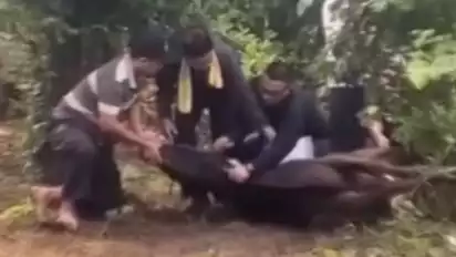 Ustaz tersebut nampak ditemani dua orang lainnya untuk memegangi sapi yang sudah tergeletak di tanah.