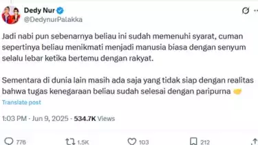 Sementara di dunia lain masih ada saja yang tidak siap dengan realitas bahwa tugas kenegaraan beliau sudah selesai dengan paripurna,” tulis kader PSI itu pada 9 Juni 2025 lalu.