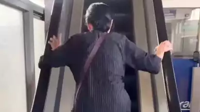 Tampak wanita yang mengenakan baju berwarna hitam dan membawa tas selempang berwarna cokelat itu tengah berupaya berjalan di eskalator seperti menaiki tangga.
