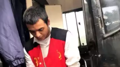 Dia melangkah perlahan sambil dituntun oleh petugas menuju ke ruang tahanan. Tak ada raut senyum di wajahnya.