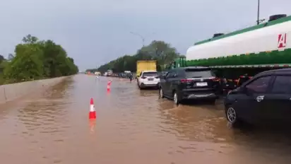 Saat ini genangan terpantau menutupi bahu luar, lajur 1 2, 3, dan 4. Namun, hanya lajur 4 yang masih dapat dilintasi.