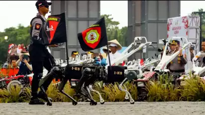 Terlihat pasukan robot polisi (Ropi) ini tampil usai Detasemen Turangga atau pasukan berkuda dan Dentasemen K9 Polri berjalan.
