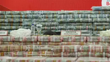 Dalam konferensi pers, Kejagung menampilkan uang sitaan senilai Rp1,3 triliun tersebut. Tampak tumpukan sangat banyak dan luas memenuhi dalam ruangan tersebut.