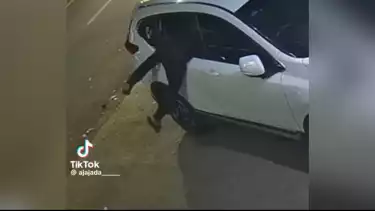 Kemudian salah seorang pria yang mengenakan pakaian serba hitam menghampiri mobil yang diparkir dan berupaya memecahkan kaca belakang mobil sebelah kiri.