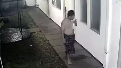 Ia terlihat mengenakan kemeja dan celana pendek berjalan hingga mengintip ke dalam kamar korban dari balik jendela.