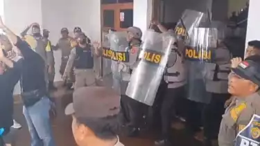 Kendari, tvOnenews.com - Aksi demonstrasi penertiban sound horeg di Kantor Wali Kota Baubau, Provinsi Sulawesi Tenggara (Sultra) berakhir ricuh dengan saling dorong antara petugas keamanan dan pendemo.