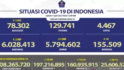 Satgas Covid-19 juga mencatat, jumlah kasus aktif yang mencakup penderita COVID-19 yang masih menjalani perawatan dan isolasi mandiri pada hari ini sebanyak 78.302 kasus aktif, turun 3.844 orang dibandingkan hari sebelumnya, Rabu (6/4).