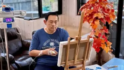 "Meski tangan kanan beliau masih diinfus, semangat untuk berkarya tak surut. Dengan tangan kiri, beliau kembali memegang kuas dan larut dalam warna-warna. Sungguh menjadi momen yang menghangatkan hati," tulis akun itu lagi.
