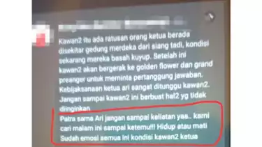 "Patra (Patra Dewa, Sekretaris BPK) Ari (Marianus Rawa Tamba, Ketua BPK) jangan sampai keliatan yaa, kami cari malam ini sampai ketemu!!! Hidup atau mati, sudah emosi semua kondisi kawan2 ketua," tulis salah satu peserta sidang yang diduga adalah Ketua DPC GMNI Banyuwangi Rino Bachtiar, Senin (28/7/2025).