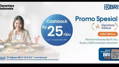 Selama periode 1 Juli hingga 30 September 2025, Anda bisa menikmati cashback sebesar Rp25.000 hanya dengan melakukan transaksi minimal Rp75.000 menggunakan QRIS BRImo. Promo ini berlaku untuk 1 kali transaksi per nasabah per hari, dengan maksimal 3 transaksi per bulan.