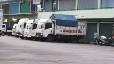 Nampak pula beberapa kendaraan truk hanya terparkir, sementara sang sopir sibuk ngobrol dengan temannya di depan pertokoan.