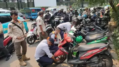 Petugas gabungan melancarkan Operasi Cabut Pentil terhadap ratusan sepeda motor yang diparkir liar di samping Mall Taman Anggrek, Jakarta Barat.