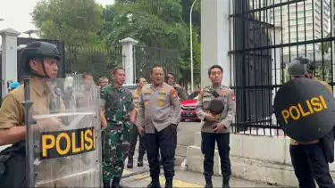 Jakarta, tvOnenews.com - Kapolda Metro Jaya, Irjen Pol Asep Edi Suheri bersama Pangdam Jaya/Jayakarta, Mayor Jenderal TNI Deddy Suryadi, memantau berlangsungnya aksi unjuk rasa di depan Gerbang Pancasila, Gedung DPR/MPR RI, pada Senin (25/8/2025).