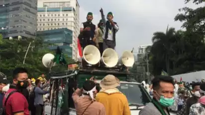 "Teman-teman mahasiswa silakan merapat ke arah mobil speaker. Izinkan kami menyuarakan pendapat kami," kata salah satu peserta aksi di Jalan M. Ridwan Rais Jakarta Pusat, Jumat sore.