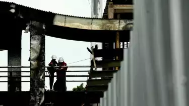 Berita Foto : Perbaikan Halte Transjakarta di Kawasan Senen Pasca Pembakaran oleh Ratusan Massa