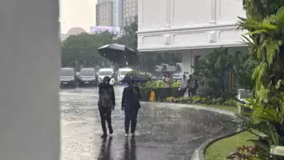 Meski hujan mengguyur, Mira Tayyiba tampak menembus keluar menggunakan payung dari mobilnya menuju kawasan Istana Kepresidenan.