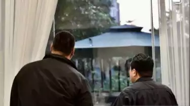 Pada foto pertama, Dito dan Erick sama-sama mengenakan kemeja gelap berdiri berdampingan di balik tirai putih tipis, menatap ke arah luar jendela kaca besar yang menghadap taman hijau.