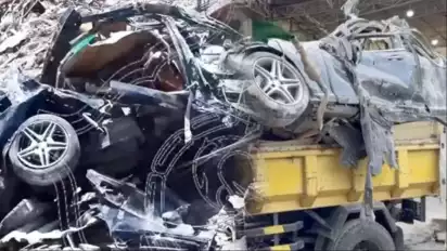 Sebuah mobil mewah berjenis Mercedes-Benz (Mercy) berwarna hitam ditemukan dalam kondisi hancur tak berbentuk tertimbun reruntuhan beton.