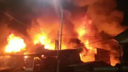 Jakarta - Sebanyak 400 bangunan yang terdiri dari rumah dan pertokoan, ludes terbakar di Pasar Gembrong, Jakarta Timur, Minggu (24/4/2022) malam.