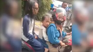 Sementara kedua anaknya yang tengah dibonceng nampak terdiam dan kebingungan.
