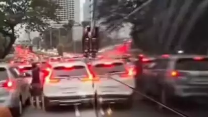 Video yang beredar di media sosial menunjukkan sejumlah pemuda meluncur bebas di antara mobil yang berhenti akibat padatnya lalu lintas.