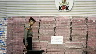 Dalam acara tersebut, KPK memamerkan tumpukan uang pecahan Rp100.000 sebagai bagian dari hasil rampasan.