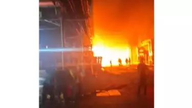 Dalam rekaman video yang beredar, tampak asap hitam membubung tinggi di atas area gudang. Kobaran besar api terlihat menyala membakar bangunan gudang tersebut.