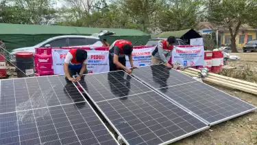 Pemasangan instalasi PLTS melibatkan teknisi Perwira Pertamina Peduli yang merakit beberapa komponen PLTS, hingga listrik bisa menerangi tenda pengungsian.
