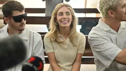Aktris film dewasa asal Inggris Tia Emma Billinger alias Bonnie Blue bersama rekannya Jackson Liam Andrew saat menjalani sidang tindak pidana ringan di Pengadilan Negeri Denpasar, Bali, Jumat (12/12/2025).