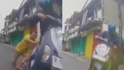 Ternyata di belakang motor tersebut, terlihat seorang pria berbaju kuning yang berupaya menahan sepeda motor itu.Â