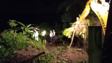 Akibatnya, material tanah longsorannya menutup akses jalan sepanjang kurang lebih 30 meter di desa setempat.