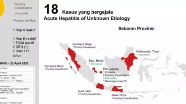 Jakarta - Kementerian Kesehatan melaporkan telah menemukan dugaan kasus Hepatitis Akut yang belum diketahui penyebabnya kepada 18 orang. Kasus tersebut berasal dari Sumatera Utara, Sumatera Barat, Kepulauan Bangka Belitung, DKI Jakarta, Jawa Barat, Jawa Timur dan Kalimantan Timur. Paling banyak di DKI Jakarta dengan 12 kasus.