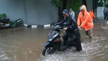 Wali Kota Jakarta Utara Hendra Hidayat membantu warga mendorong sepeda motor yang mogok akibat banjir di Jakarta Utara pada Senin (12/1/2026).
