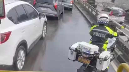 Terlihat motor patwal tersebut berhenti di lajur Transjakarta. Beberapa kendaraan mobil langsung masuk ke jalur Transjakarta untuk melintas.