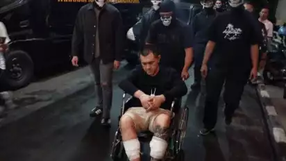 Ia harus menggunakan kursi roda dengan tangan terikat kabel ties saat memasuki gedung.