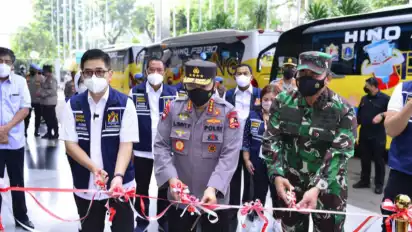 Jakarta, 21/8 - Kapolri Jenderal Pol Listyo Sigit Prabowo melepas operasional 34 bus vaksinasi keliling kerja sama TNI/Polri dan Kamar Dagang Indonesia (Kadin) dalam rangka percepatan vaksinasi Covid-19 untuk menjangkau masyarakat wilayah pinggiran. "Bus ini nantinya akan digunakan membantu pelayanan vaksinasi untuk masyarakat di daerah yang tak terjangkau kegiatan vaksinasi massal terpusat. Ini bentuk layanan terhadap kegiatan vaksinasi secara mobile dan menyentuh masyarakat lapisan bawah," kata Sigit di Gedung JCC, Jakarta Pusat, Sabtu (21 AGustus 2021).