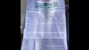 Jakarta - Aksi konvoi puluhan sepeda motor yang membawa atribut Khilafah saat melintas di wilayah Jakarta Timur yang viral di media sosial, diketahui sempat membagikan selebaran bertuliskan “Khilafatul Muslimin” kepada sejumlah warga. Seorang saksi mata bernama Misdi yang berprofesi sebagai pedagang di Kramat Jati, mengaku dirinya sempat dihampiri oleh beberapa orang dari rombongan konvoi dan memberikan selebaran tersebut.