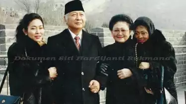 Soeharto saat berfoto bersama istrinya, Tien dan kedua anak mereka Titiek dan Tutut. (Ist)