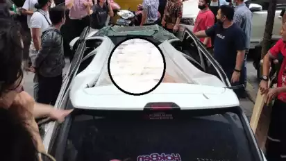 Sebuah mobil yang tengah terparkir tepat di bawah apartemen korban pun, seketika ringsek saat tubuh korban tersangkut di atas atap mobil tersebut.