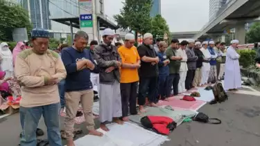 Kemudian, pengunjuk rasa beramai-ramai memasang sajadah menghadap kiblat untuk beribadah di aspal Jalan HR Rasuna Said.