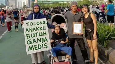 Santi berjalan dengan memegang papan putih dengan tulisan besar "Tolong Anakku Butuh Ganja Medis".