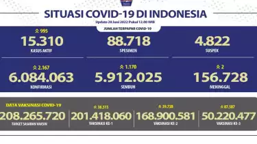 Satgas Covid-19 juga mencatat, jumlah kasus aktif yang mencakup penderita Covid-19 yang masih menjalani perawatan dan isolasi mandiri pada hari ini sebanyak 15.310 kasus aktif, naik 995 orang dibandingkan hari sebelumnya, Senin (27/6/2022).