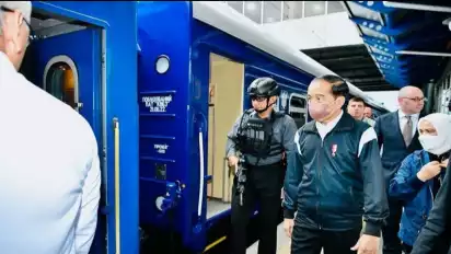 Menurut keterangan pers yang diterima tvOnenews.com di Jakarta, Presiden Joko Widodo beserta rombongan menumpangi kereta luar biasa (KLB) dari Stasiun Central Kyiv tepat pukul 19.00 waktu setempat.
