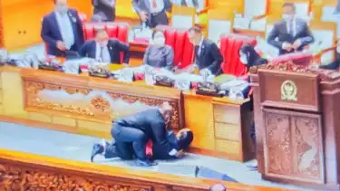 Jakarta - Anggota Banggar DPR RI, Muhidin Mohammad Said, terjatuh tepat di depan meja sidang Rapat Paripurna ke-26 Dewan Perwakilan Rakyat (DPR) RI di Gedung DPR RI, Jl. Jenderal Gatot Subroto, Senayan, Jakarta, Kamis (30/6/2022).