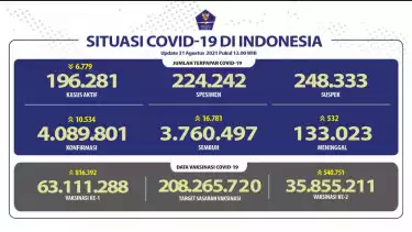 Jakarta - Kasus harian Covid-19 di Indonesia berdasarkan data dari Satuan Tugas Penanganan Covid-19 Selasa (31/8) terkonfirmasi positif bertambah 10.534 sehingga akumulasi menjadi 4.089.801 kasus.
