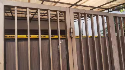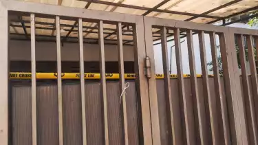 Garis polisi tersebut melintang pada pagar utama rumah berwarna krim itu dengan tinggi sekira ukuran 2 meter dan lebar 3 meter.