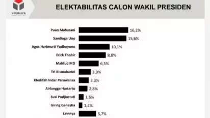 Temuan survei Y-Publica menunjukkan elektabilitas Puan paling tinggi di antara sejumlah nama populer lainnya, yakni mencapai 16,2 persen dalam bursa cawapres itu.