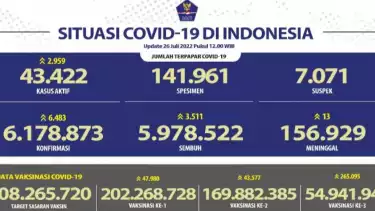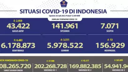 Laporan Satgas Penanganan Covid-19 di Jakarta, Senin (25/7/2022), menyebutkan dengan penambahan tersebut maka akumulasi kasus konfirmasi positif sejak pandemi terjadi di Indonesia pada Maret 2020 berjumlah 6.178.873 kasus.