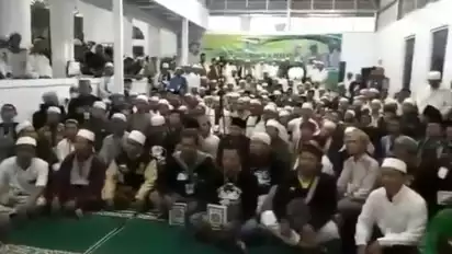 Sekelompok orang yang duduk di lantai, tampak dalam video tersebut, mengikuti kalimat yang diucapkan oleh seseorang dengan menggunakan pengeras suara. (Endra Kusumah/act)