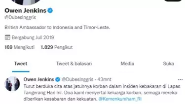 Jakarta – Duta Besar Inggris untuk Indonesia dan Timor Leste, Owen Jenkins, melalui akun twitter resmi miliknya @DubesInggris, menyampaikan duka yang sangat mendalam kepada korban kebakaran yang terjadi di Lembaga Pemasyarakatan (Lapas) Klas 1 Tangerang yang menewaskan 41 warga binaan.